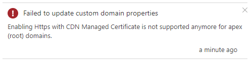 After that, I tried to go back to the CDN and enable the Custom Domain HTTPS for the apex (root) domain. evidently that is no longer supported: